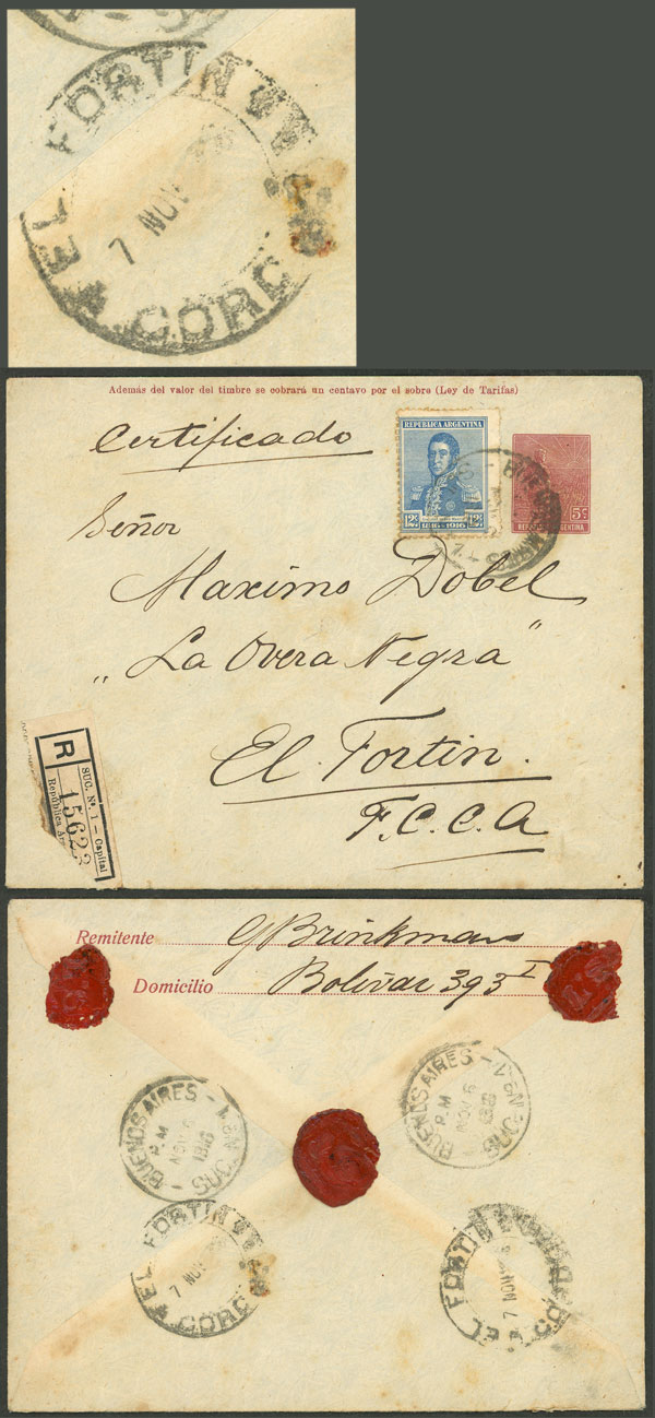 Plowman stationery envelope uprated with 12c., sent by registered mail from Buenos Aires to EL FORTÍN (Córdoba) on 6/NO/1916, with 2 arrival backstamps, VF quality!