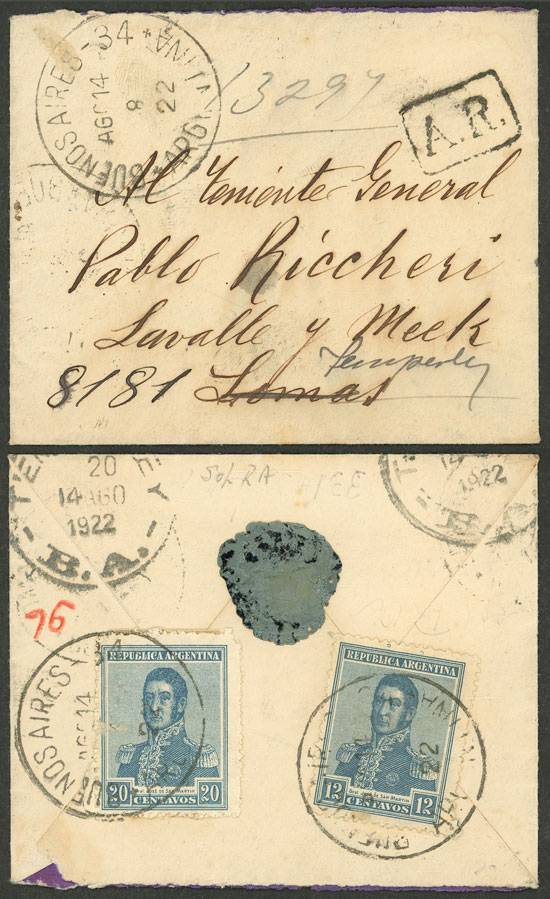 registered cover with AR sent from Buenos Aires to Temperley on 14/AU/1922, franked on back with 32c. (San Martín with RA sun wmk 12c. + 20c.), with arrival mark for the same day, excellent quality! (Image)