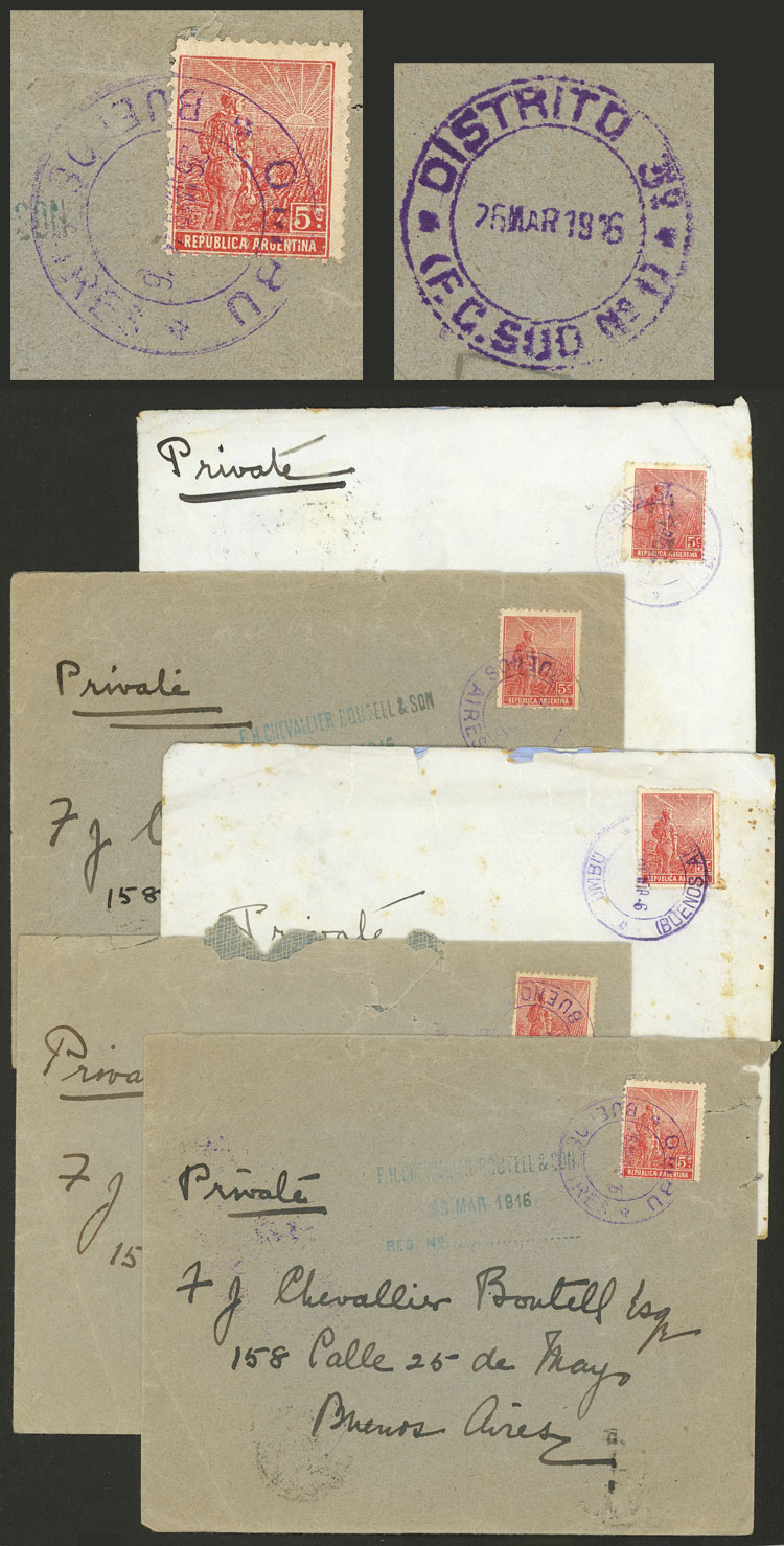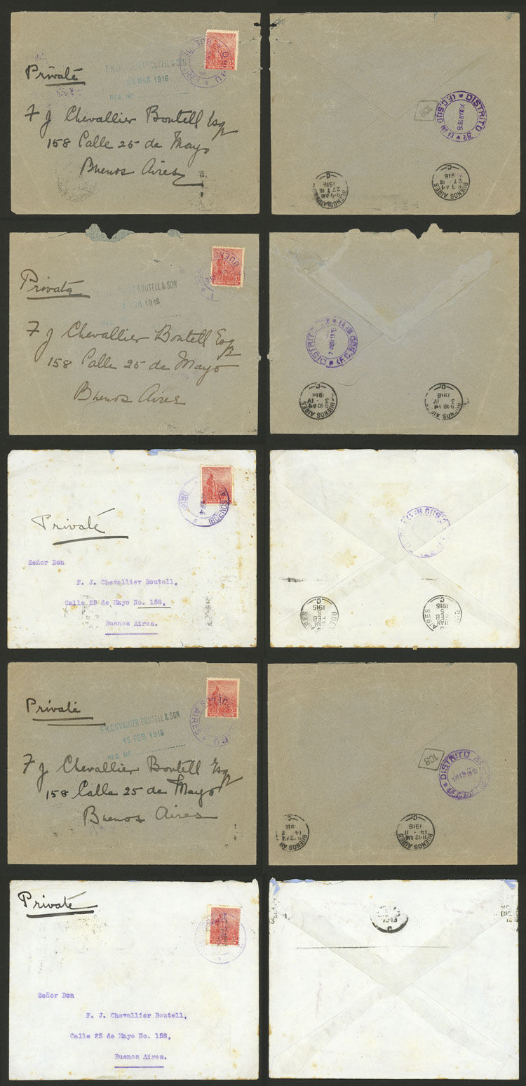 RARE POSTMARK + RAILWAY TRAVELING PO: 5 Covers sent from OMBÚ to Buenos Aires between 1916 and 1916, all franked with 5c. and with violet postmark of OMBÚ, and 4 of them have on back violet marks of railway PO: "DISTRITO 3º - (F.C.SUD