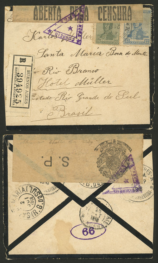 21/SE/1918 Buenos Aires to Rio Branco, Brazil: Mourning cover sent by registered mail franked with 22c., with a fantastic Brazilian censor label and marks on front and back, VF! (Image)