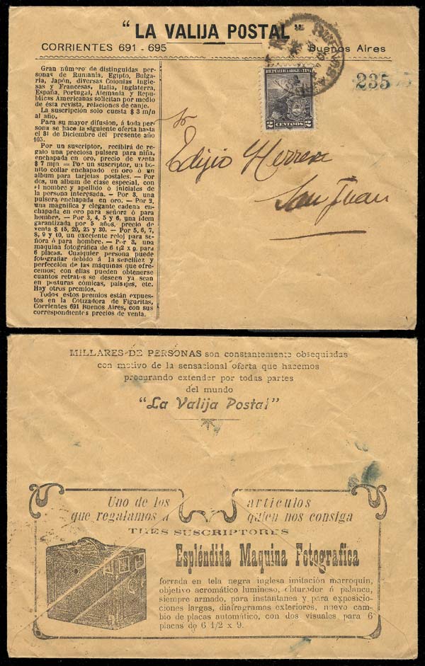 advertising on front and reverse: "La Valija Postal" (journal) and photographic cameras, franked with 2c. Liberty (GJ.219), sent from Buenos Aires to San Juan in 1905, excellent! (Image)
