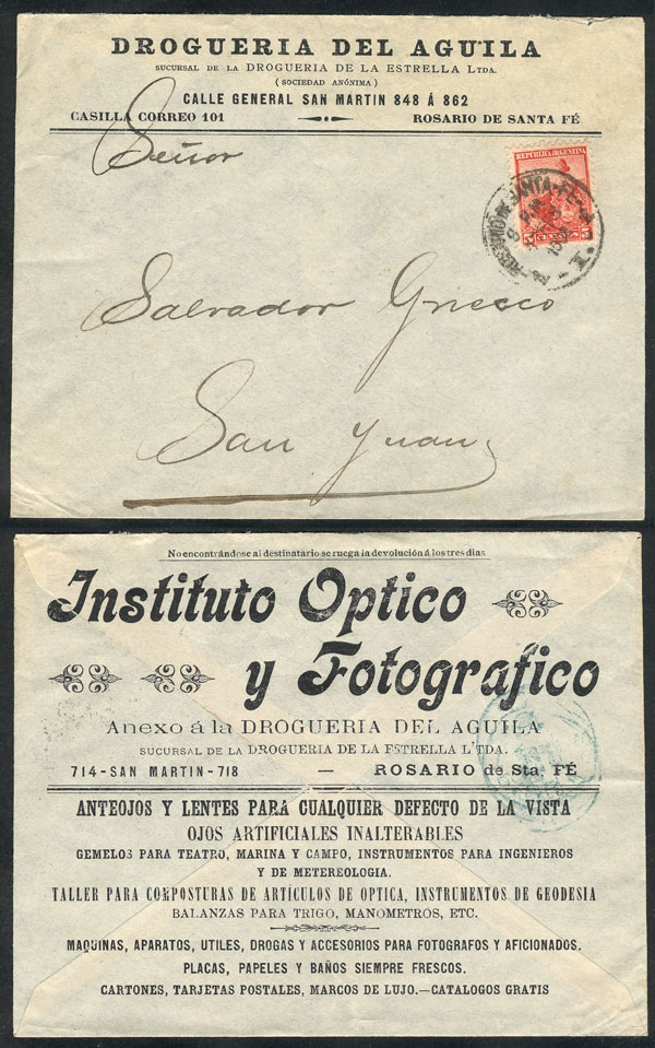 advertising on front and reverse: Drugstore, optical store, photography, glasses etc., franked with 5c. Liberty (GJ.222), sent from Rosario to San Juan on 17/FE/1908, excellent! (Image)