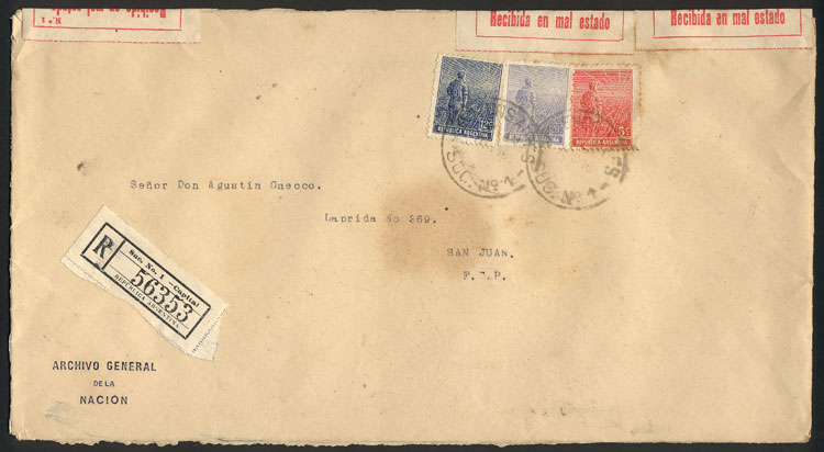Registered cover sent from Buenos Aires to San Juan on 15/DE/1915 franked with 37c. (Plowman 5c. + 12c. + 20c.), it received 3 official seals at top "Received in bad condition", excellent and rare! (Image) (Image-02)
