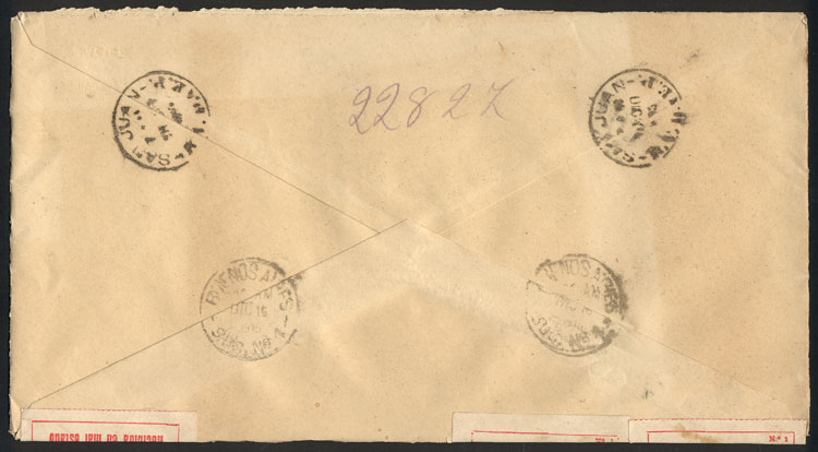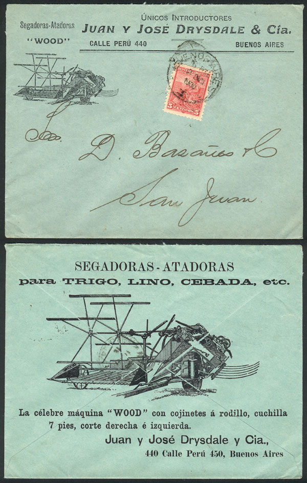 advertising on front and reverse: "Filing cabinet for letters, iron boxes, rubber tubes, agricultural machine", franked with 5c. Liberty (GJ.222), sent from Buenos Aires to San Juan on 14/DE/1905, excellent! (Image)