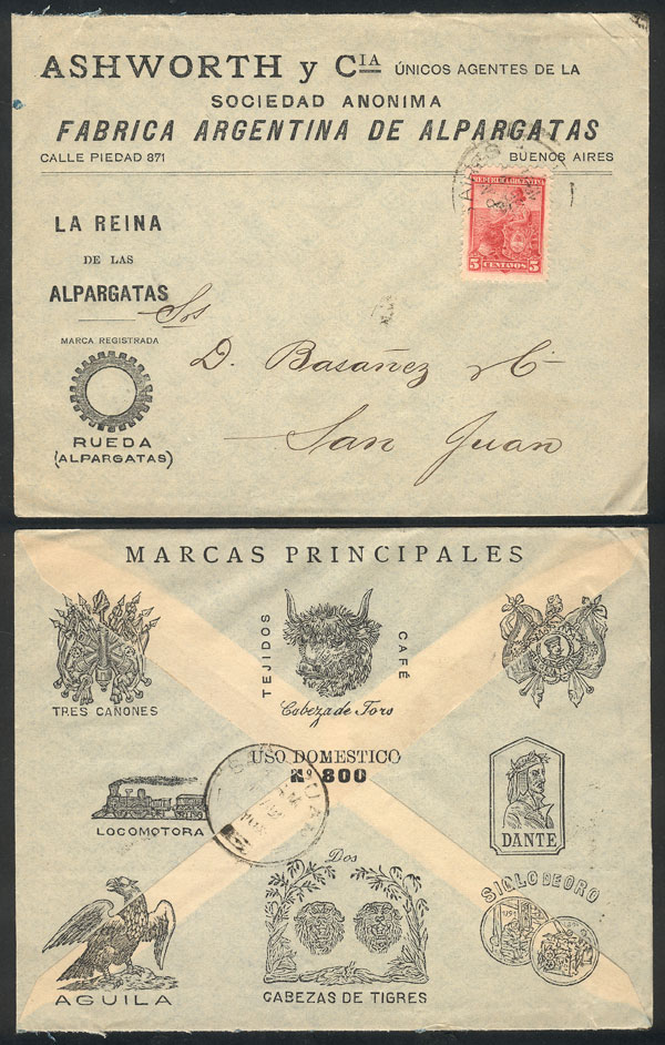Advertising cover (alpargatas) franked with 5c. Liberty and sent to San Juan in AP/1900, VF quality! (Image)