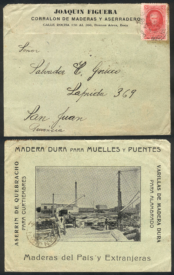beautiful advertising for "Sawmill and wood warehouse", sent from Buenos Aires to San Juan on 3/AU/1910 franked with 5c., excellent! (Image)