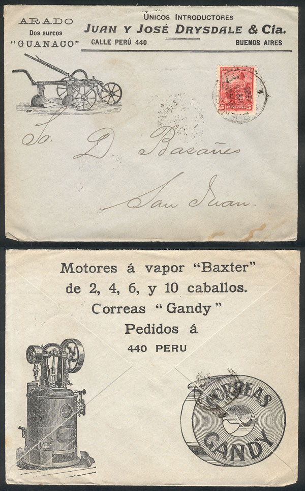 printed advertising of "Guanaco plows, straps, Baxter steam engines ", franked with 5c. Liberty and sent from Buenos Aires to San Juan on 15/JUN/1900, excellent!