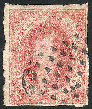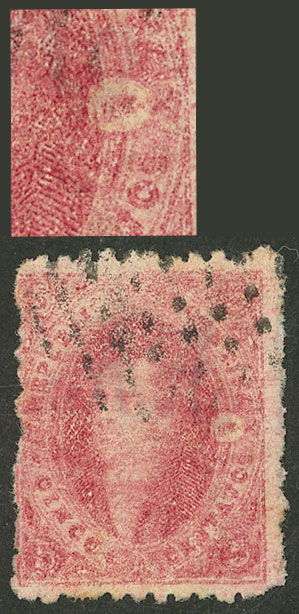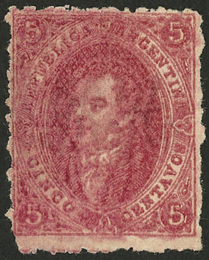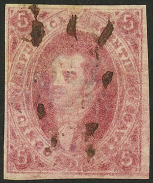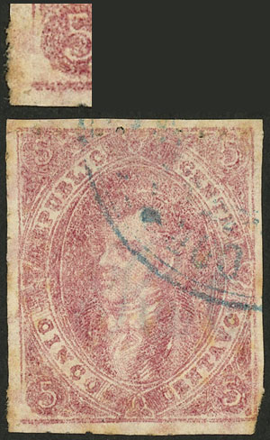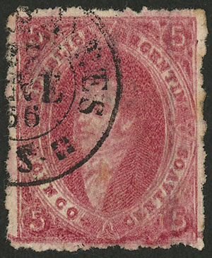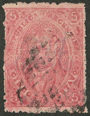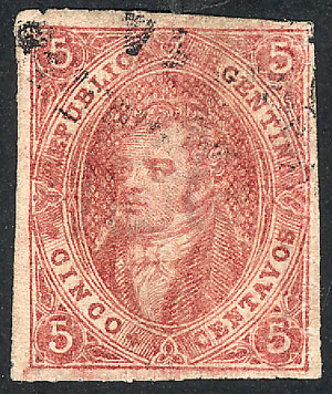 4th printing, dull rose, with variety: Small spot at left of Rivadavia, with dotted cancel of Rosario, excellent! (Image)
