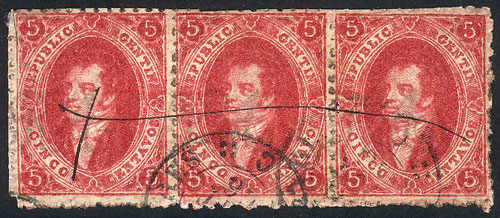 5th printing, positions 71-72-73 on plate D, double cancellation: pen + datestamp of Buenos Aires, superb, rare. Strips from 5th printing are very scarce! (Image)