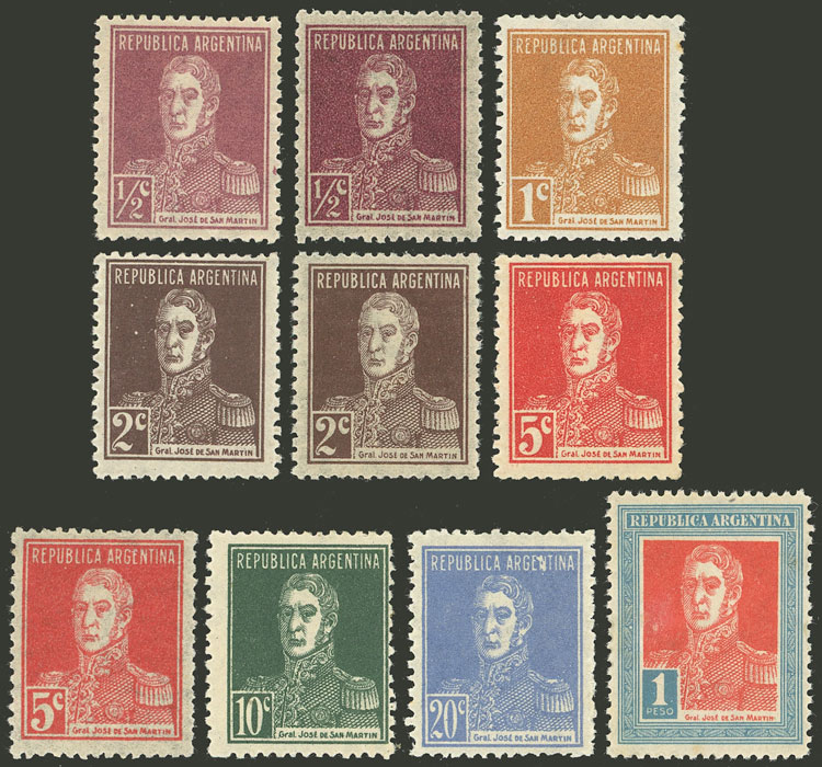 GJ.626/632 + 633/635, 1927 San Martín with Ahorro Postal wmk, cmpl. set of 10 values including the 3 stamps printed on transparent paper, VF quality!