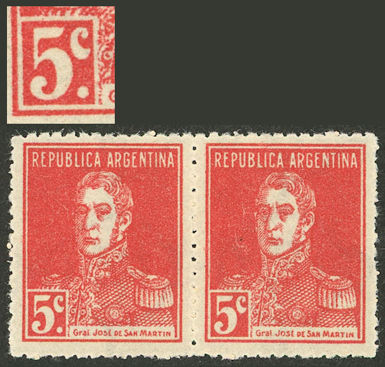 1927 5c. San Martín with Ahorro Postal wmk, variety: PAIR WITH AND WITHOUT PERIOD, MNH (+50%), excellent! (Image)