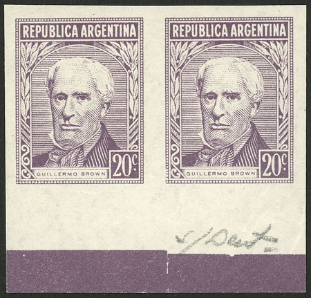 GJ.1034P, 20c. San Martín, rare IMPERFORATE PAIR printed on unsurfaced paper, MNH, superb! (Image)