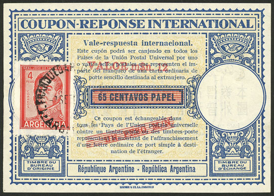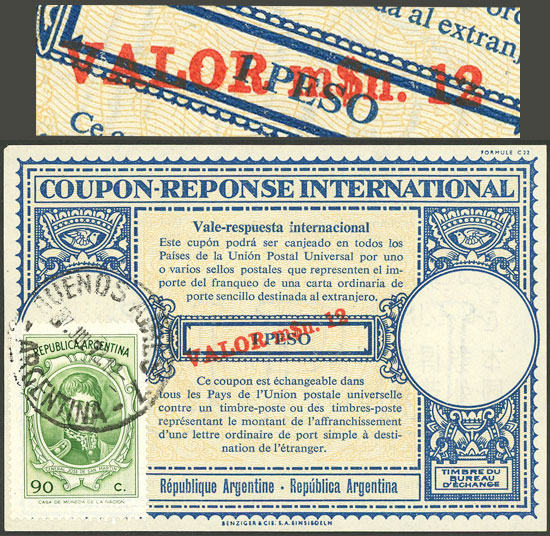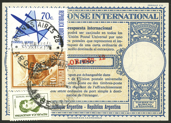 IRC (cancelled 28/JUN/1973) with an original value of "1 PESO" surcharged in red "VALOR m$n 12" IN THICK LETTERS, also with additional postage of 10c. Incan Bridge + 70c. Stylized airplane + 8c. Belgrano (to make a total of 1 Peso ley