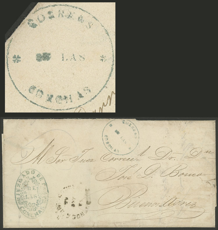 cancel of "CORREOS DE LAS CONCHAS" in blue circle, on a folded cover sent from Las Conchas to Buenos Aires, with arrival mark of 22/AU/1865, excellent quality, with Alberto Solari certificate (Image)