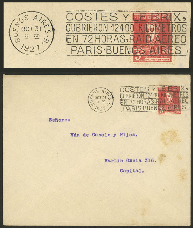Cover with special slogan cancel: "Costes y Le Brix cubrieron 12400 kilómetros en 72 horas - Raid aéreo Paris-Buenos Aires", used in Buenos Aires on 31/OC/1927, VF! (Image) (Image-02)