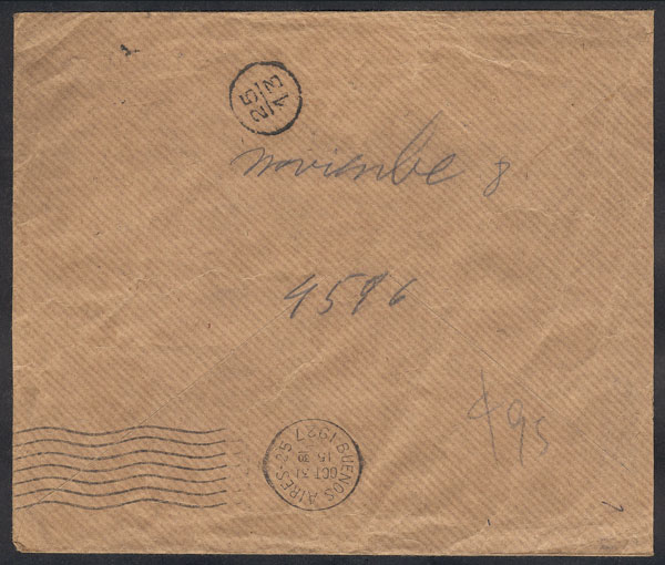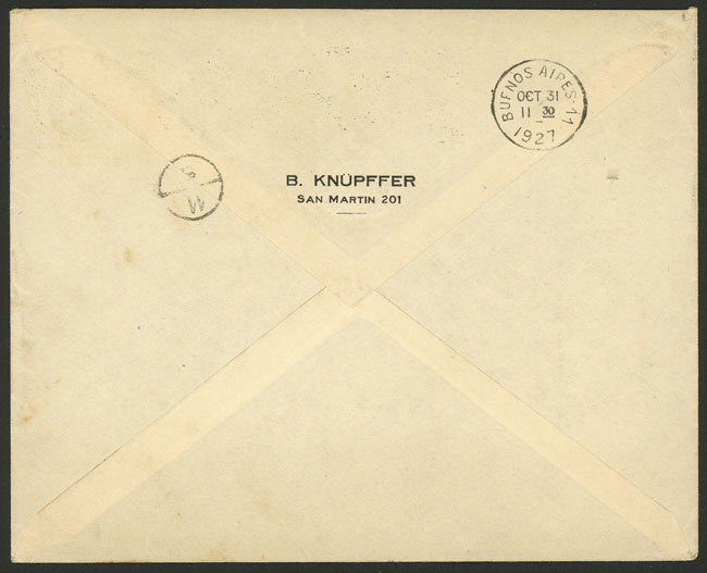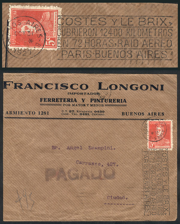 Cover used in Buenos Aires on 31/OC/1927, with 5c. franking and slogan cancel: "Costes and Le Brix flew 12,400 kilometers in 72 hours, Paris-Buenos Aires", excellent quality, scarce! (Image) (Image-02)
