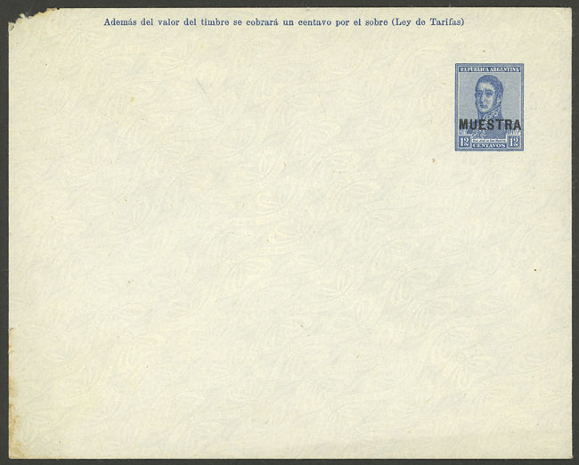 GJ.SOB-66, 1917 12c. San Martín only known with MUESTRA overprint, extremely rare, minor defect in one corner else very fine, good opportunity! (Image)