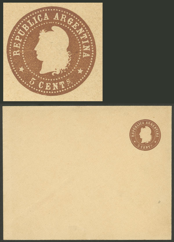 1899, rare ESSAY of envelope with value 5c. "Liberty head" (unadopted design), printed in chocolate color, wove paper, 147 x 117 mm, excellent quality, possibly unique!