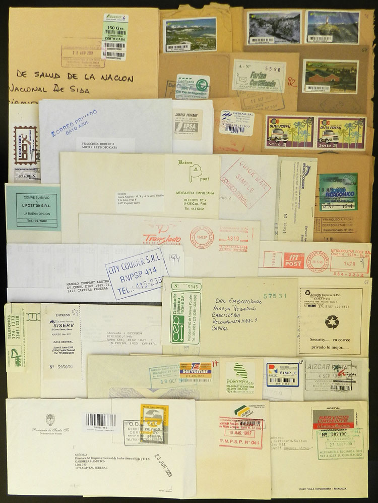 Security Express, Porteña S.R.L., Servemar, La Camionera Mendocina, SEPRIT Postal, Farlen, Oliva Postal, Pronto Box, EPSA, Del Oeste Argentino, O.D.L., Rayo Azul, TRANSLYF, Fuego Paq, Correo Patagónico, and many more. All the covers with marks,