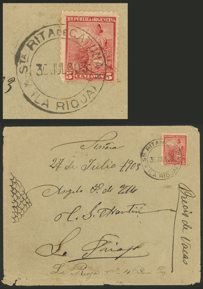 VERY RARE POSTMARK: Cover sent to La Rioja on 30/JUL/1903 franked with 5c. Seated Liberty cancelled "SANTA RITA DE CATUNA" (La Rioja), very rare!