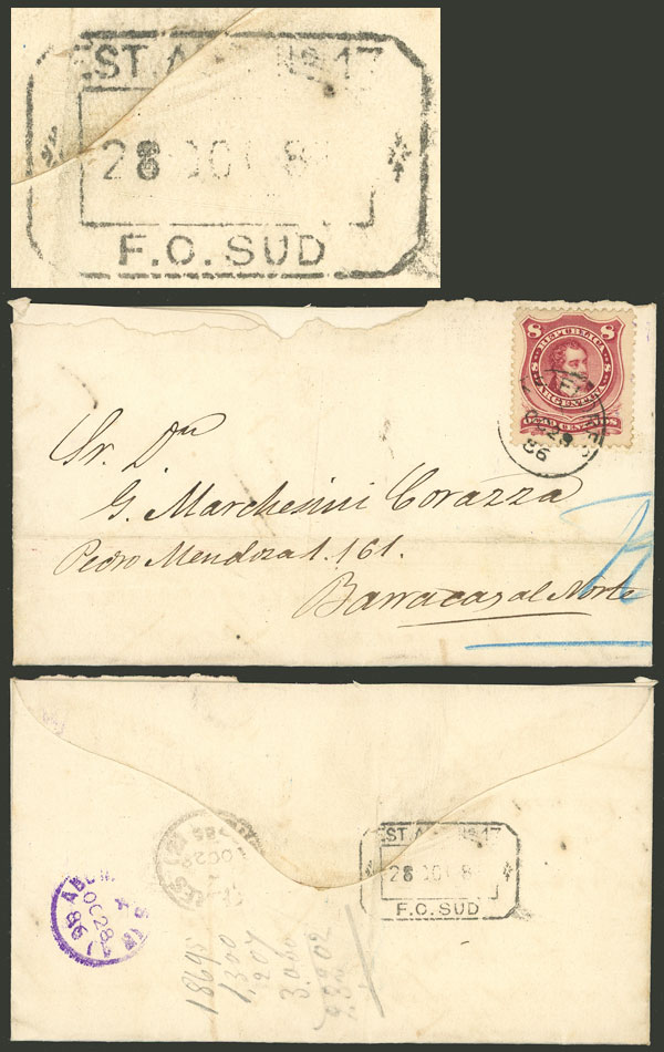 Commercial cover sent from LAS FLORES to Barracas al Norte (Buenos Aires) on 28/OC/1886 franked with 8c., on back there is a rectangular datestamp of "EST. AMB. Nº 17 - F. C. SUD" for the same date, VF! (Image)