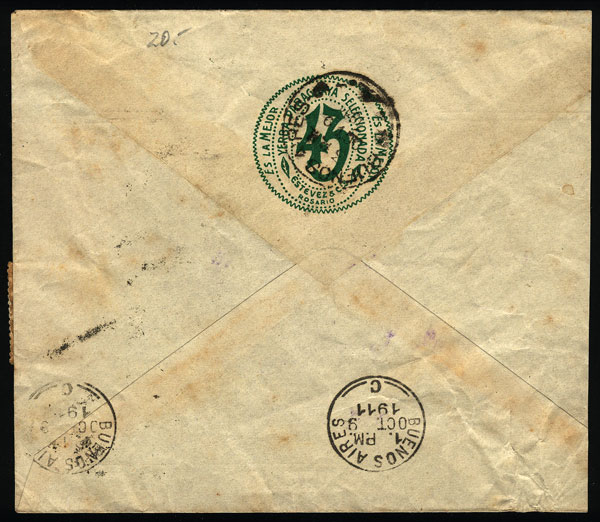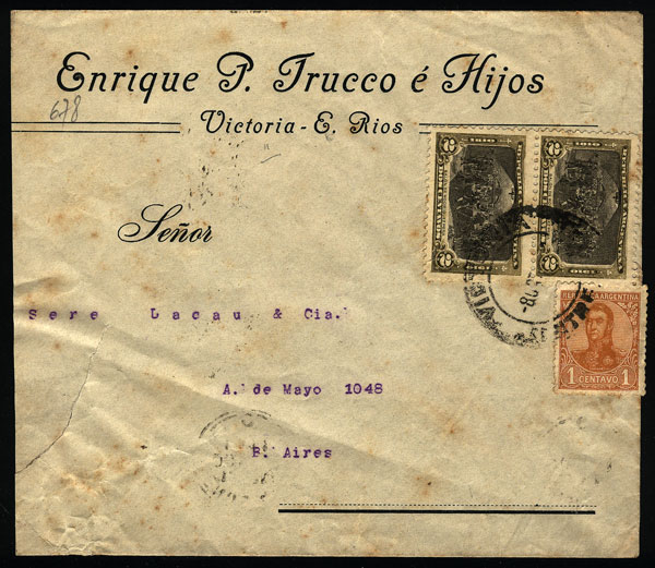 Cover with corner card and on back advertising for yerba mate, sent from "VICTORIA" (Entre Rios) to Buenos Aires in 1911. (Image) (Image-02)