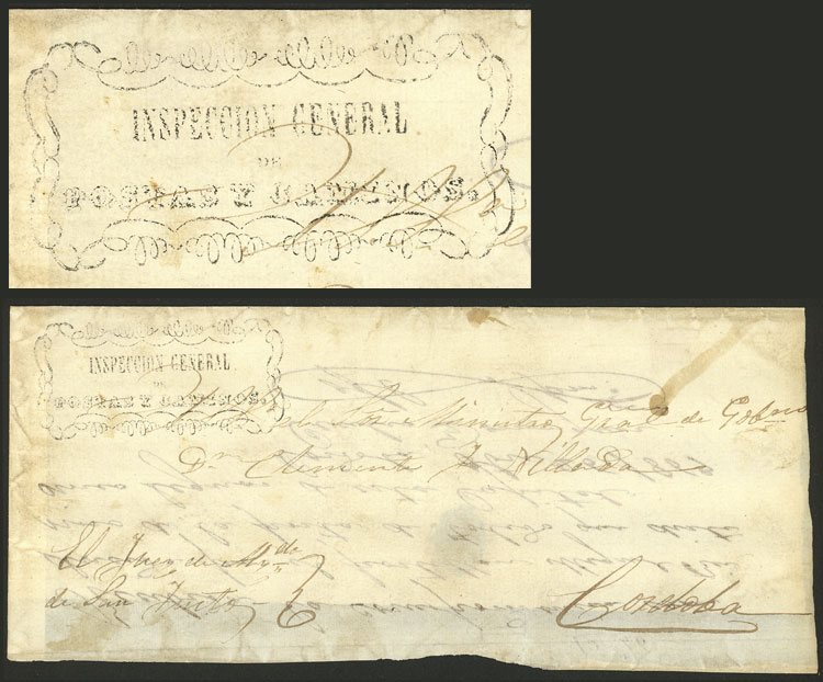 cover used in 1860s (genuine), with a FORGED pre-stamp mark "INSPECCIÓN GENERAL DE POSTAS Y CAMINOS" in black, produced by Abarca in 1960/70 on genuine covers that he obtained from old archives. For a time he managed to deceive Victor Kneitschel, who