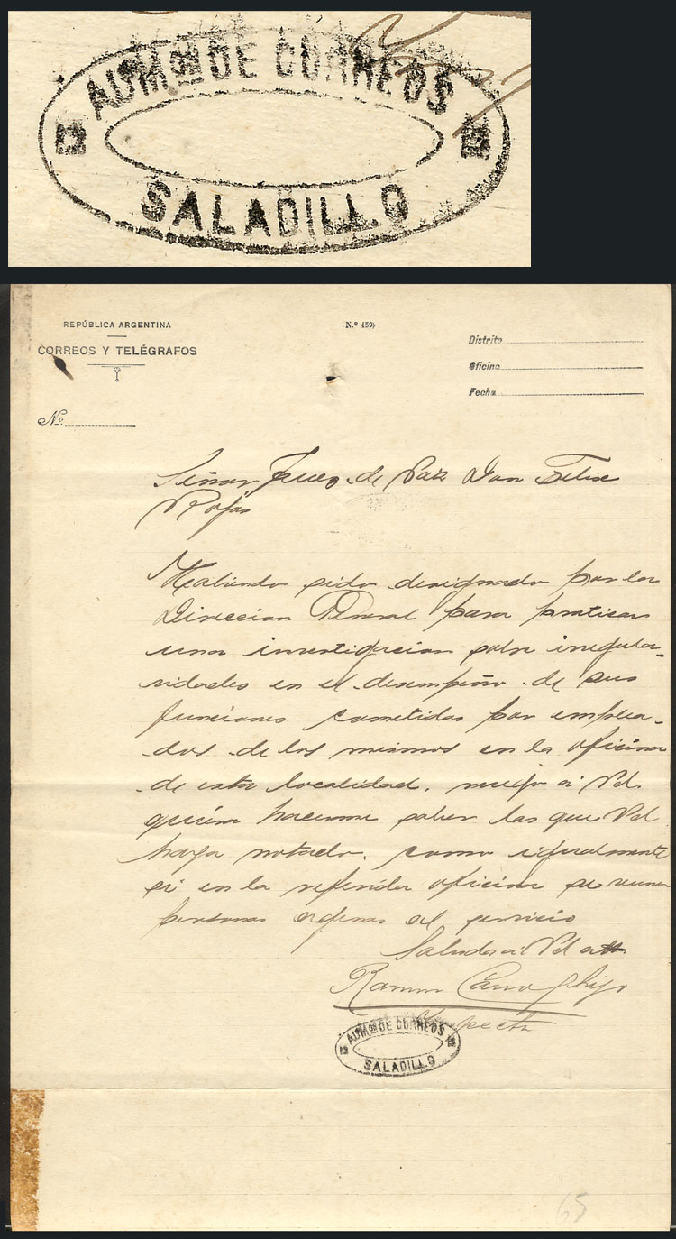 1880, document sent to the Justice of the Peace of Saladillo with oval handstamp "ADMON DE CORREOS - SALADILLO", very interesting! (Image)