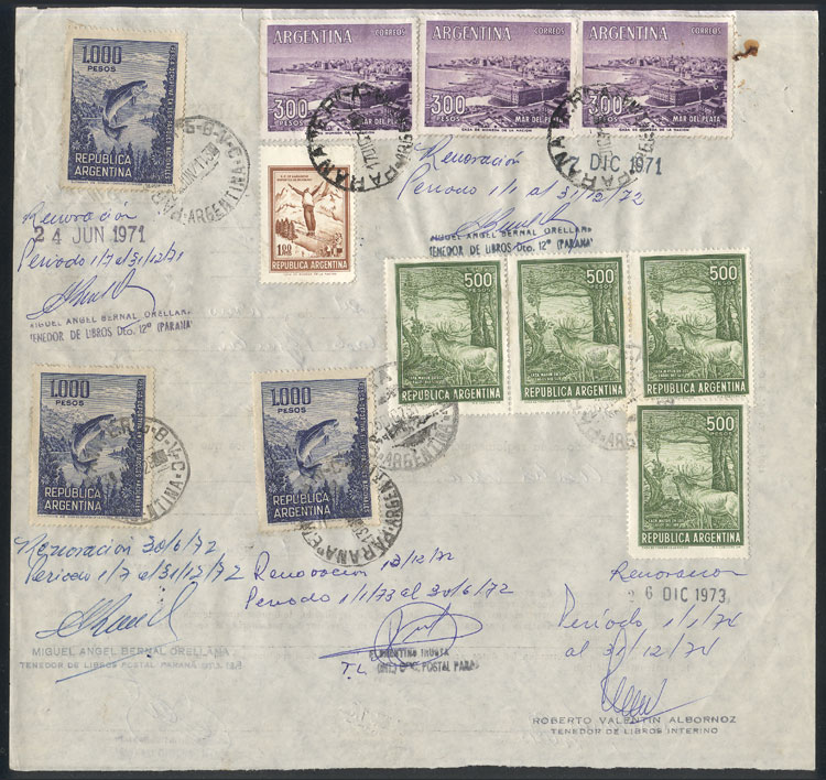 Receipt for payment for the Reply Paid service between the years 1971 and 1974, with spectacular postage of 19,000P. on front and back, VF!