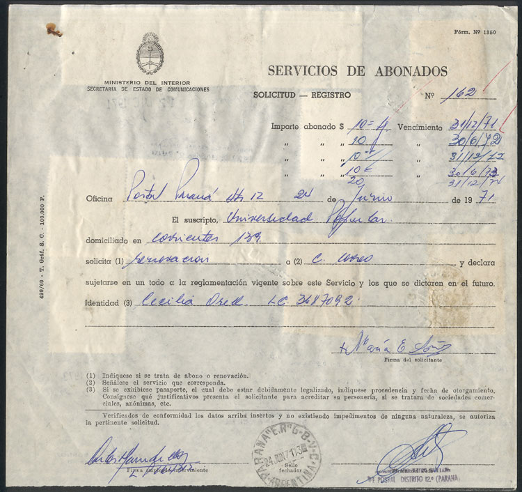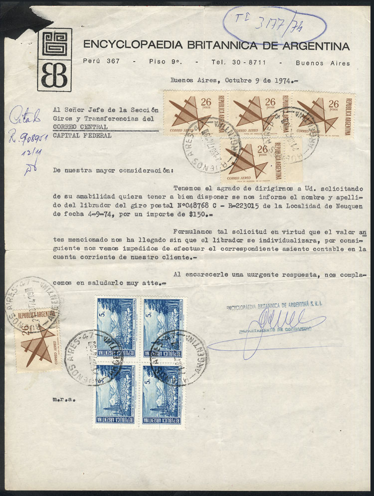 9/OC/1974 asking for information to the Post in order to obtain the details of the sender of a postal money order, with postage to pay the corresponding fee, VF quality, rare!