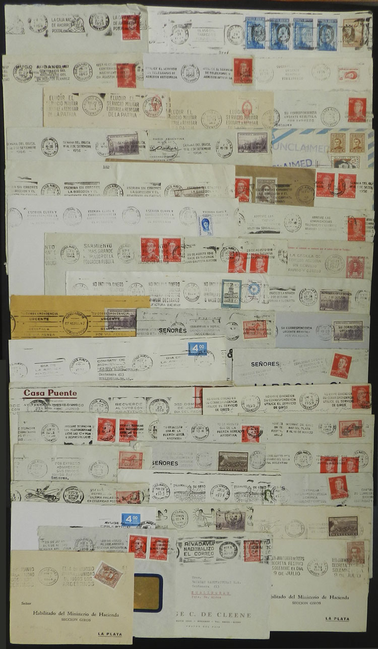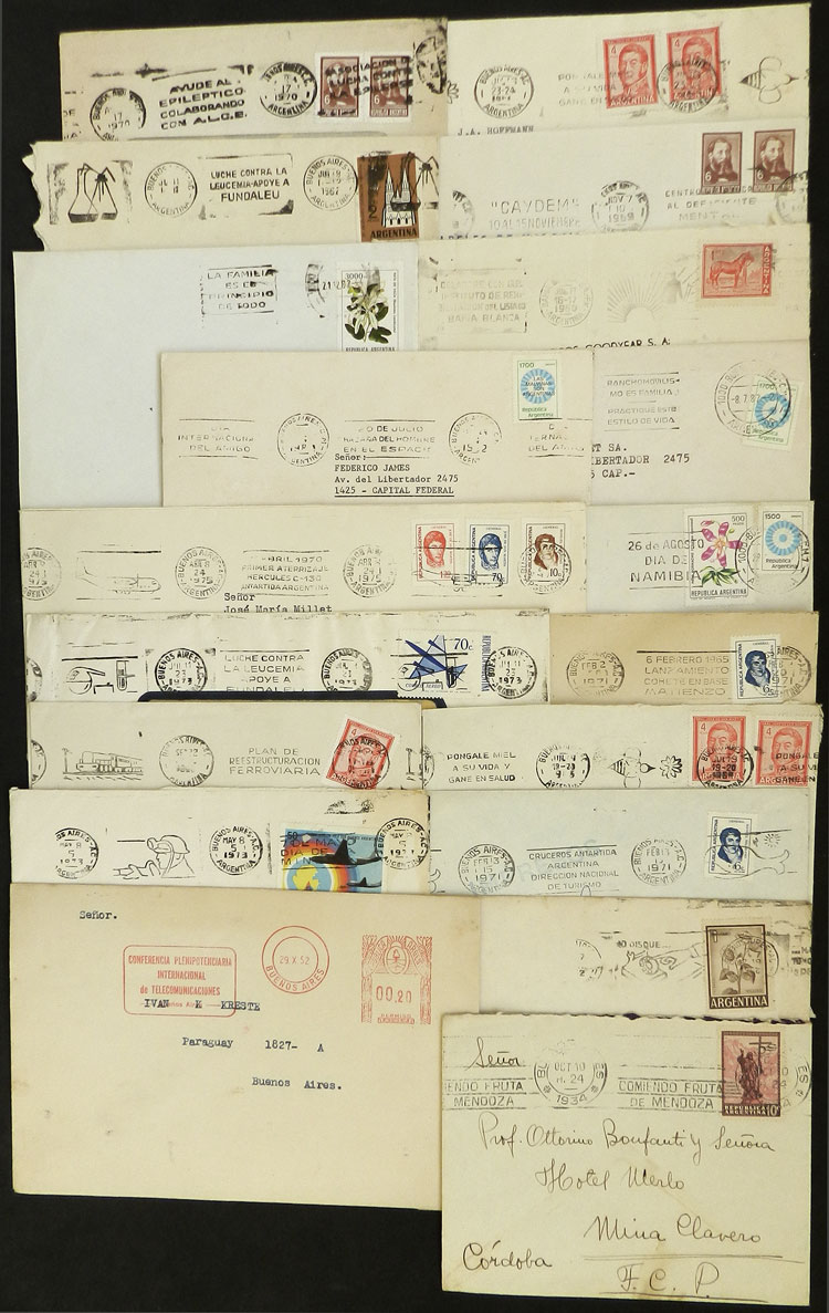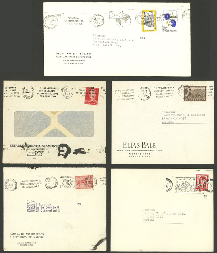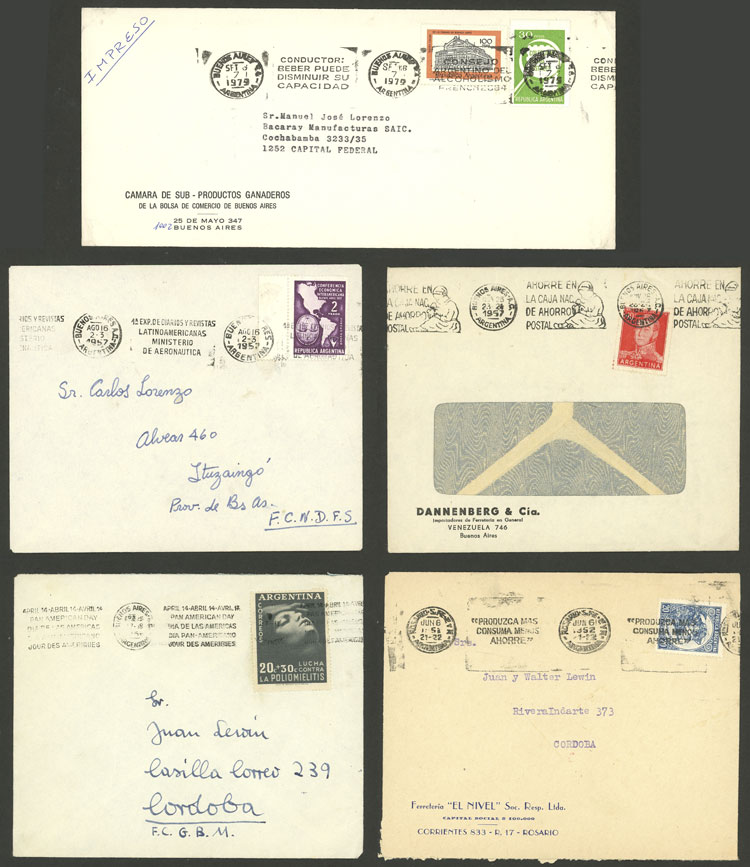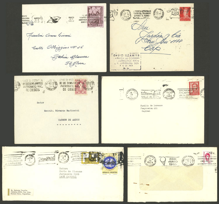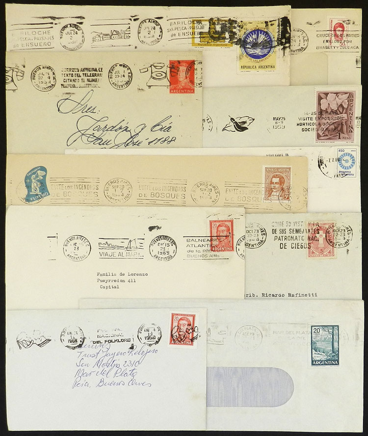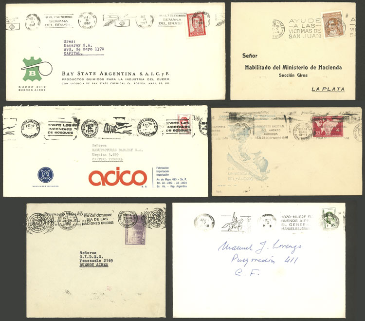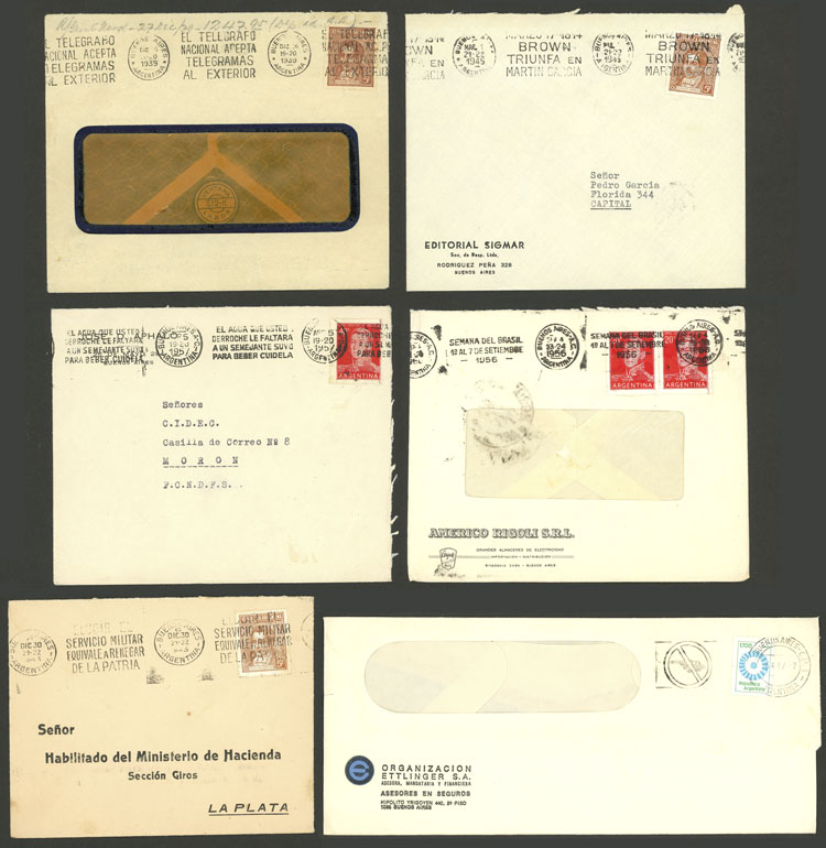 THEMATIC CANCELS: 59 Covers of varied periods, all with machine cancels with advertising slogans, varied topies, for example: Money, aviation, sugar, saving, contamination, holidays, sea, flowers, police, ships, Antarctica, telephone,