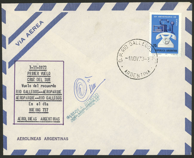 1/NO/1973 Río Gallegos - Aeroparque (Buenos Aires), "Cruz del Sur" first flight by Aerolíneas Argentinas, cover with signature of Boeing 737 line manager, arrival backstamp, rare! (Image) (Image-02)
