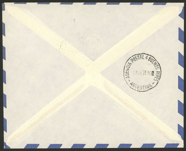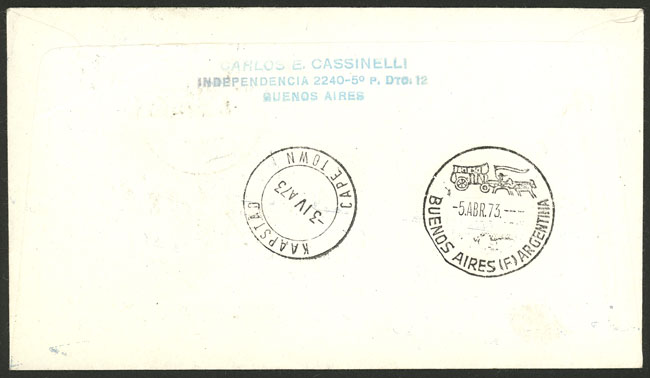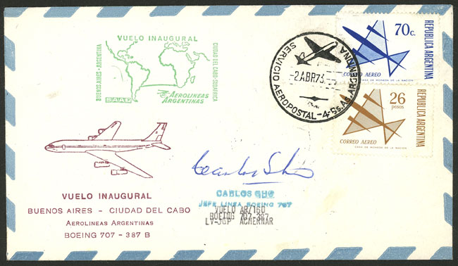 2/AP/1973 Buenos Aires - South Africa and back, first flight of Aerolíneas Argentinas with special handstamp, arrival backstamp, and signed by Commander Carlos Gho (very rare!) (Image) (Image-02)