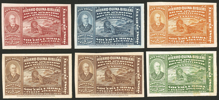 Sanitario, 6 PROOFS of revenue stamps for "HIERRO-QUINA-BISLERI, aperitif that restores the blood + Nocera Umbra mineral water", illustrated with pair of LIONS, VF quality!