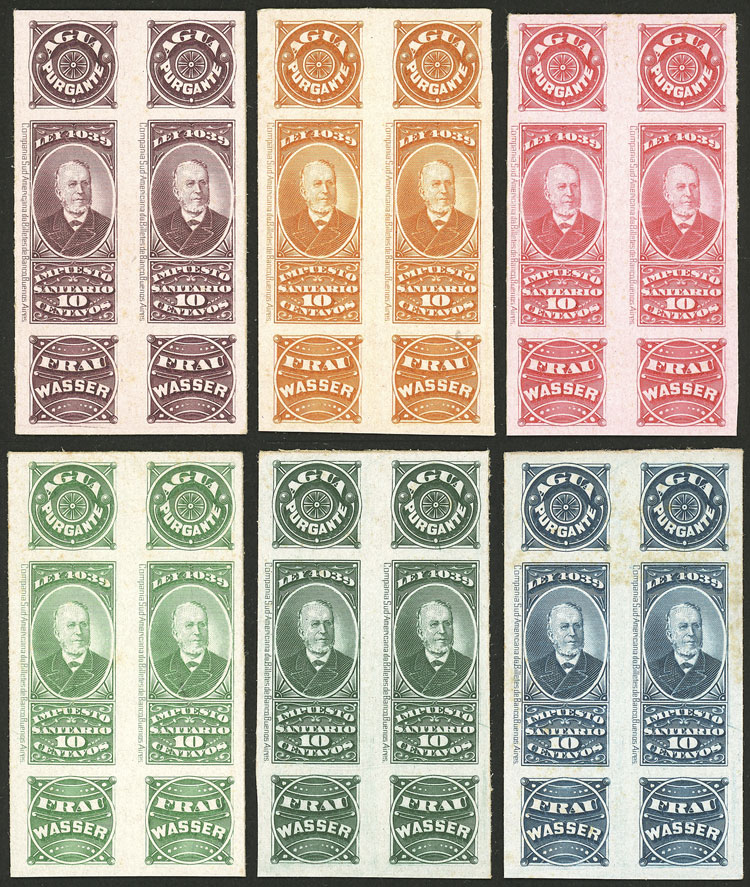 Sanitario, 6 PROOFS of revenue stamps for FRAU WASSER laxative, VF quality! (Image)