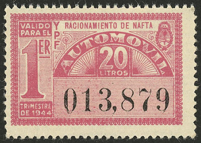 RACIONAMIENTO DE NAFTA: Year 1943, 20 liters for car, VF quality! (Image)
