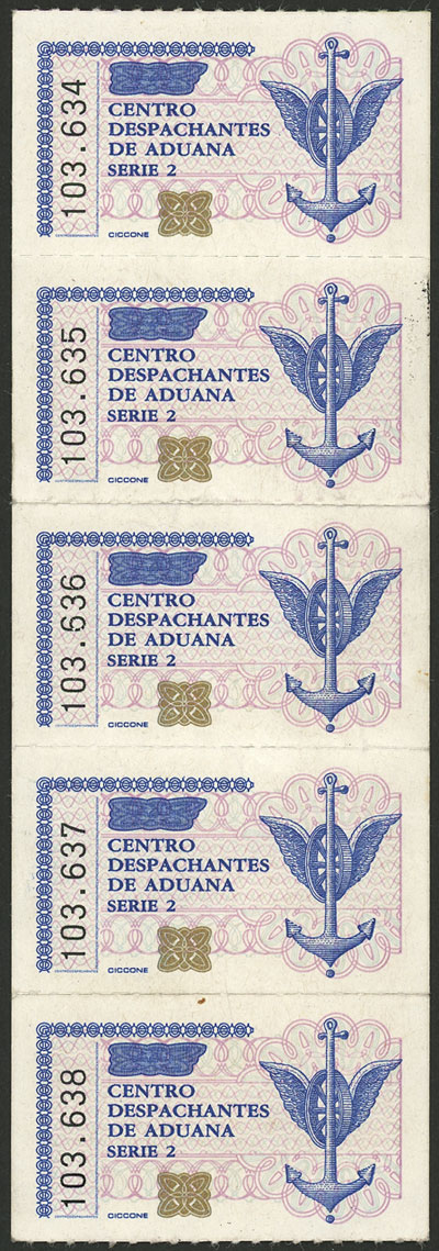 1980, rare self-adhesive revenue stamp of Centro de Despachantes de Aduana, strip of 5, very scarce! (Image)