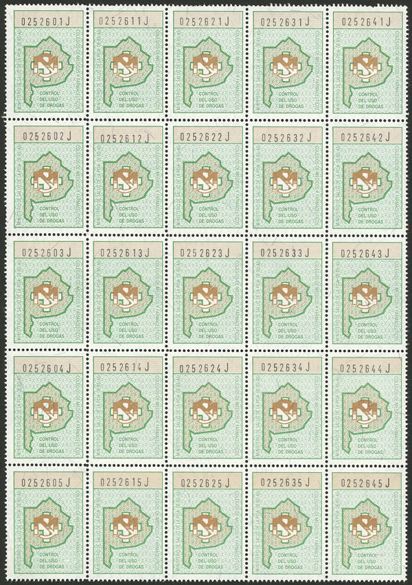 1980, very rare revenue stamp of "Control de Usos de Drogas" of province of Buenos Aires, mint block of 25, most of VF quality! (Image)