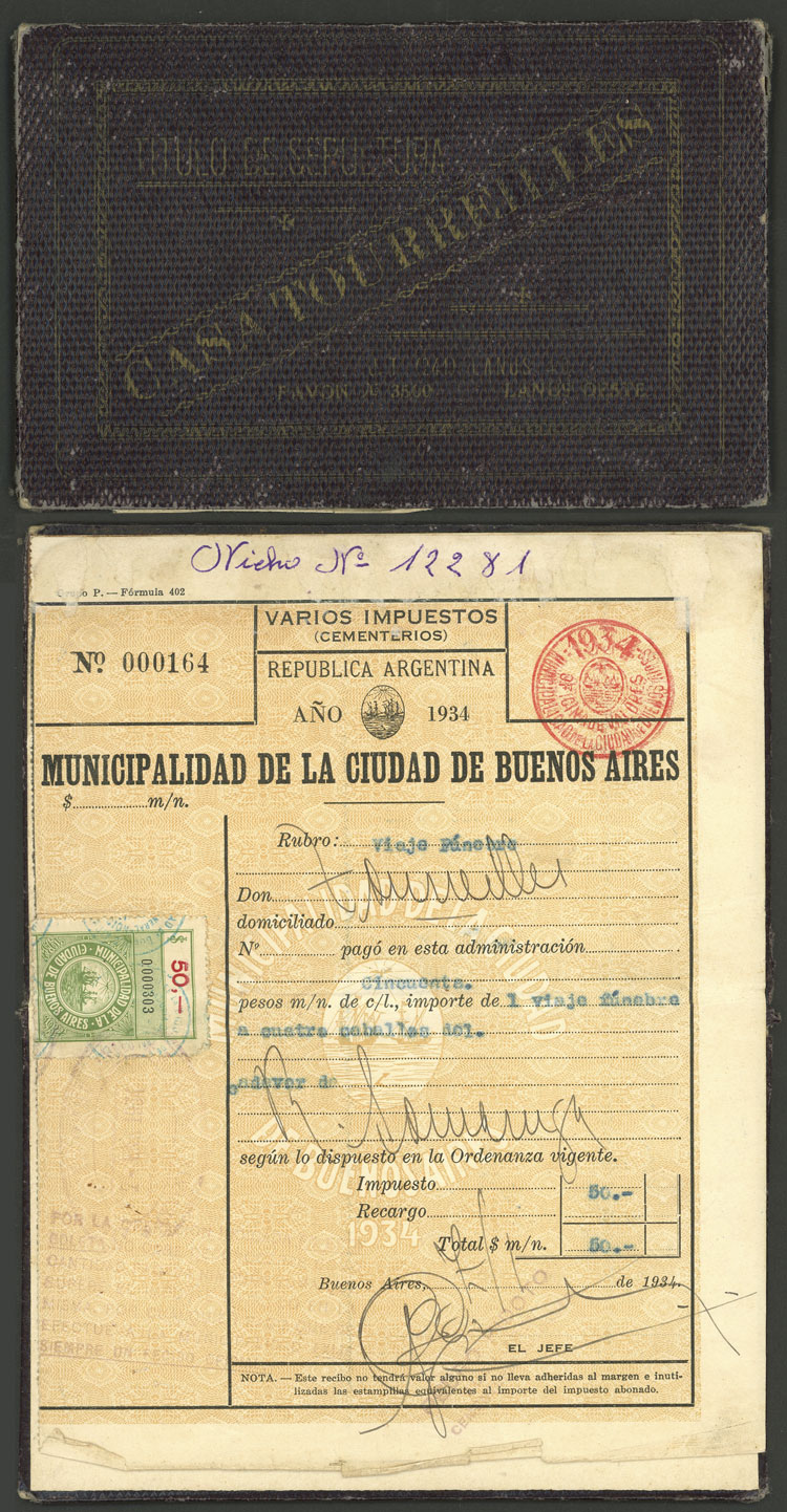 Buenos Aires: Tax payment card for HEARSE SERVICE of the year 1934, with revenue stamp of $50, very interesting! (Image)