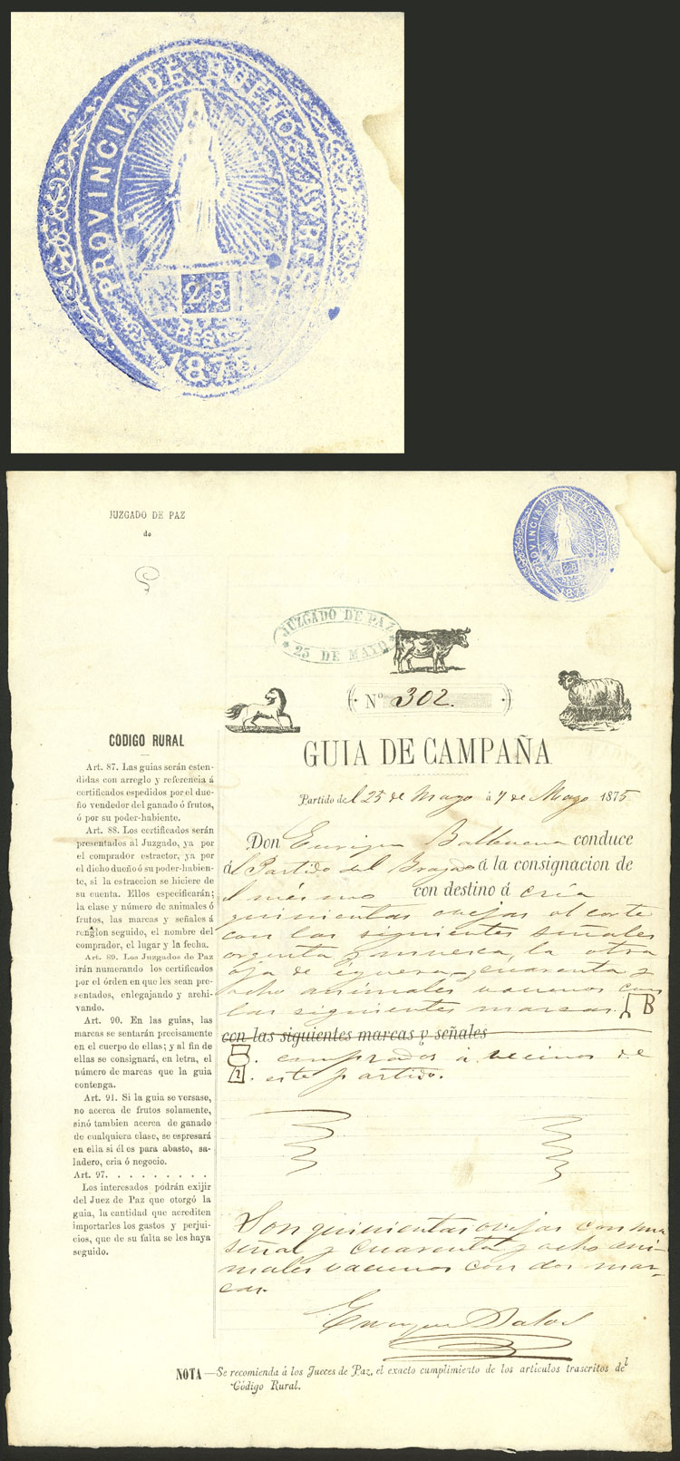 of Buenos Aires, revenue stamped paper, document (cattle movement) with 25P value dated in 1875 in Veinticinco de Mayo, very attractive, rare! (Image)
