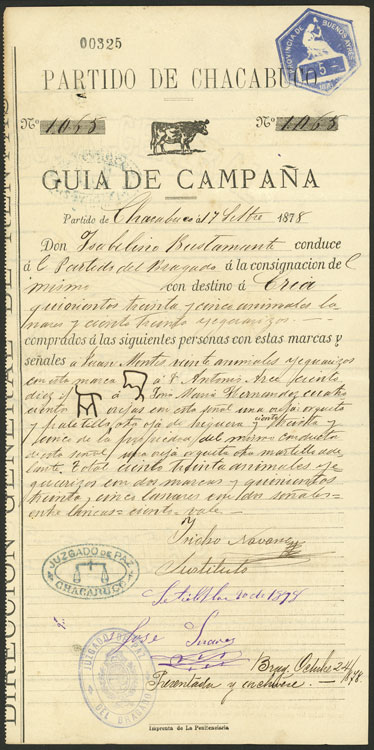 of Buenos Aires, revenue stamped paper, document (cattle movement) with 5P value dated in 1878 in Chacabuco, very attractive, rare! (Image)
