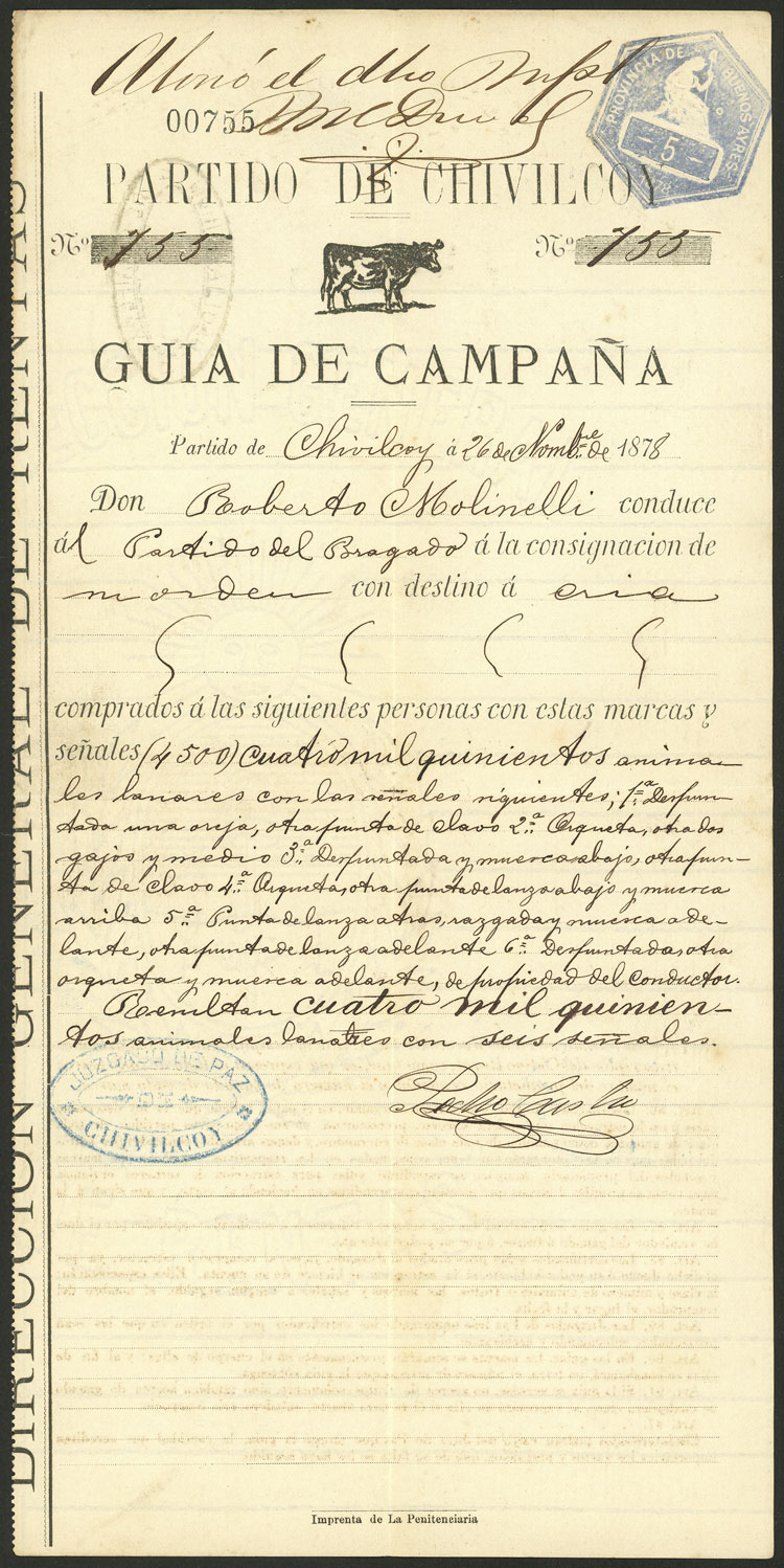 of Buenos Aires, revenue stamped paper, document (cattle movement) with 5P value dated in 1878 in Chivilcoy, very attractive, rare! (Image)