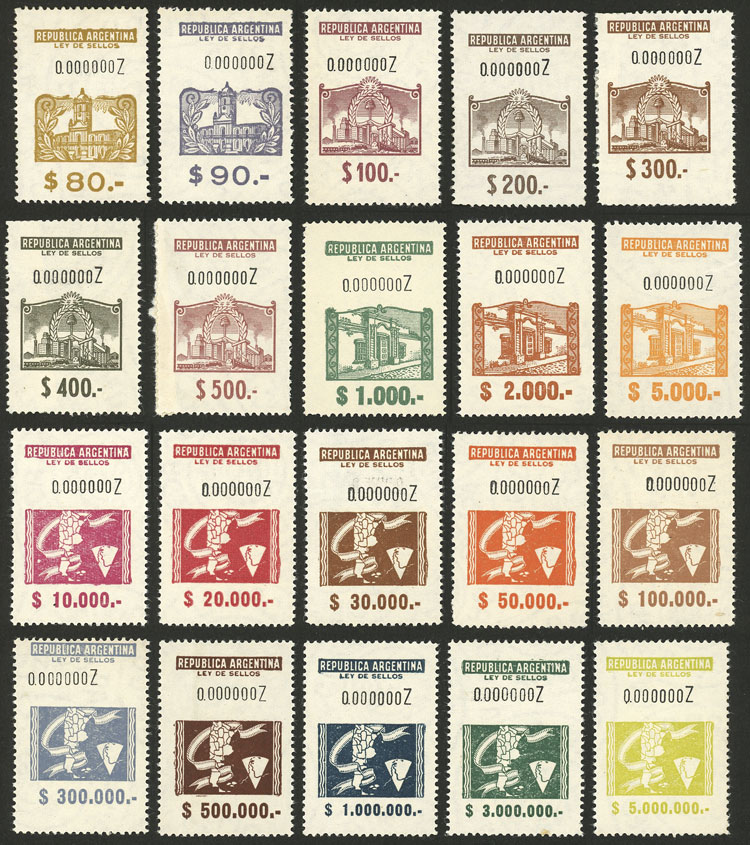 SPECIMENS with numbering "0.000.000", "Z" series, Ley de Sellos, lot of 20 stamps of values between $80 and $5,000,000, several vignettes: "Cabildo of Buenos Aires", "train, ship and industries", "House of Tucumán" and "Map of Argentina