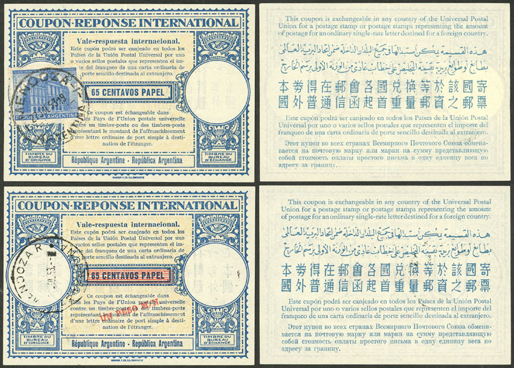 of IRC with new value due to change in the rate (both with original printed value of 65c.), one of 27/JUL/1953 with additional postage of 35c. to complete the new rate of 1P., the other one of 28/AU/1953 overprinted with the new value of 1P., very