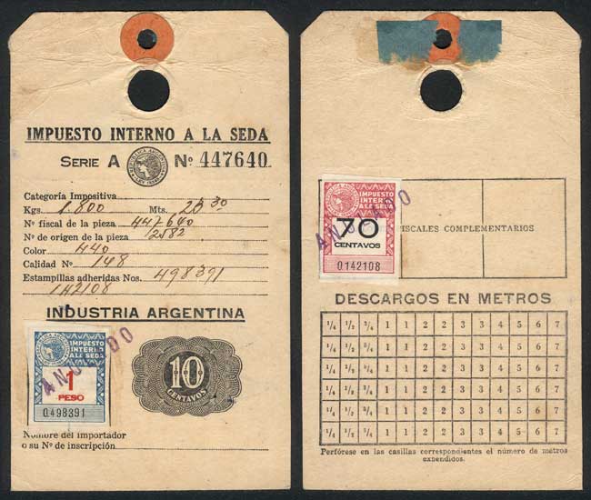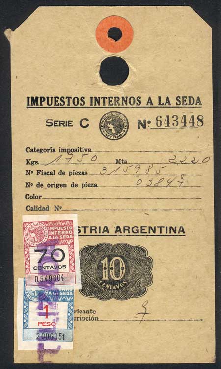 INTERNO (silk): Rare stamps of 1P. and 70c., used on tag for a 1,800k-roll, excellent quality, very few known examples! (Image)