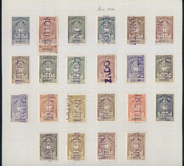 OF CORRIENTES: Year 1916, set of 22 revenue stamps between 5c. and 500P., mint and cancelled "Inutilizado", mounted on old album page, VF general quality, rare!