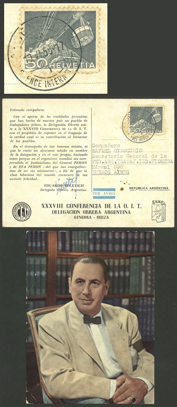 postcard commemorating the Argentine delegation to the XXXVIII ILO Congress in Geneve, Switzerland (with image of then President Juan Perón and interesting printed text), sent from the Congress to Buenos Aires, with special postmark and signature of