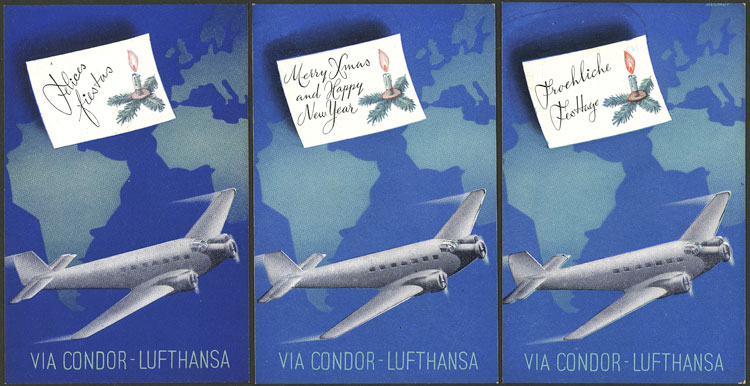 New Year greeting postcards of CONDOR-LUFTHANSA for 1938/9, with greetings in English, German and Spanish, unused, superb quality, rare group! (Image) (Image-02)