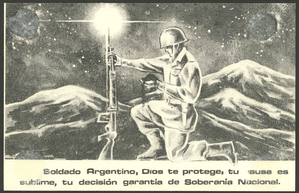 BORDER DISPUTE CHILE-ARGENTINA: Circa 1978, postcard of the Air Force with view of a soldier in the mountains in the south, with inscription "Argentine soldier, may God protect you, your cause is sublime, your decision is guarantee of
