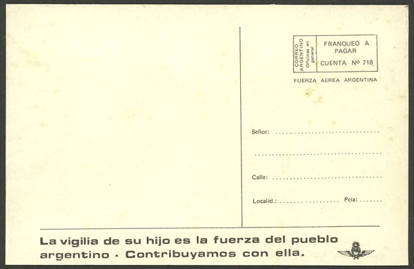 national sovereignty", PC given to conscripts at the border area with Chile in 1978, when both countries almost go to war over the possession of Picton, Lennox and Nueva islands. On back with text: "The vigil of your son is the strength of the